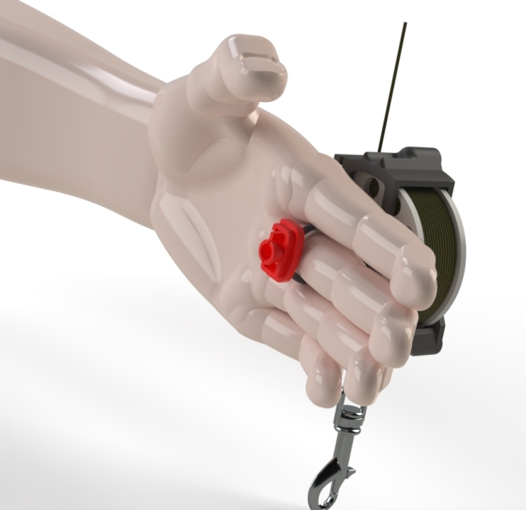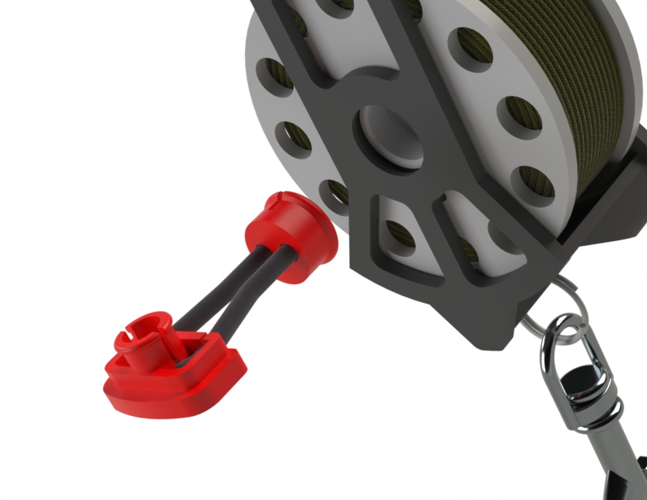 Mit der kompakten unverlierbaren Spule mit Halterung kann das nicht mehr passieren. Die Spule wird mit einem Finger gehalten. Der Finger wird so durch die drehbare Fingerschlaufe gesteckt, dass die Spule auf dem Handrücken zu liegen kommt. Dadurch wird die Greif- und Haltefunktion der Hand nicht beeinträchtigt und es sind immer beide Hände frei, um mit der einen Hand die SMB festzuhalten und mit der anderen Hand den Atemregler oder den Inflatorschlauch zum Befüllen zu bedienen.