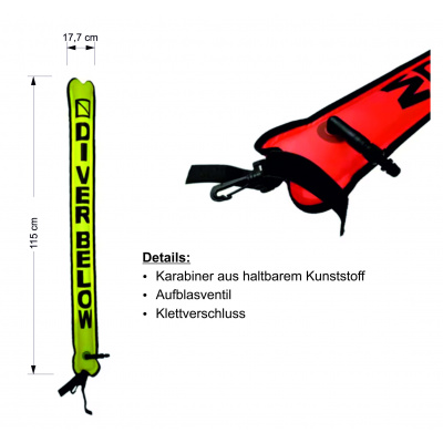Die Boje ist mit einem Aufblasventil ausgestattet. Damit kann die Boje unter Wasser mit Atemluft gefüllt werden. An der Unterseite ist ein Karabiner aus stabilem Kunststoff befestigt. Die Boje wird nach dem Einrollen mit einem Klettverschluss fixiert.